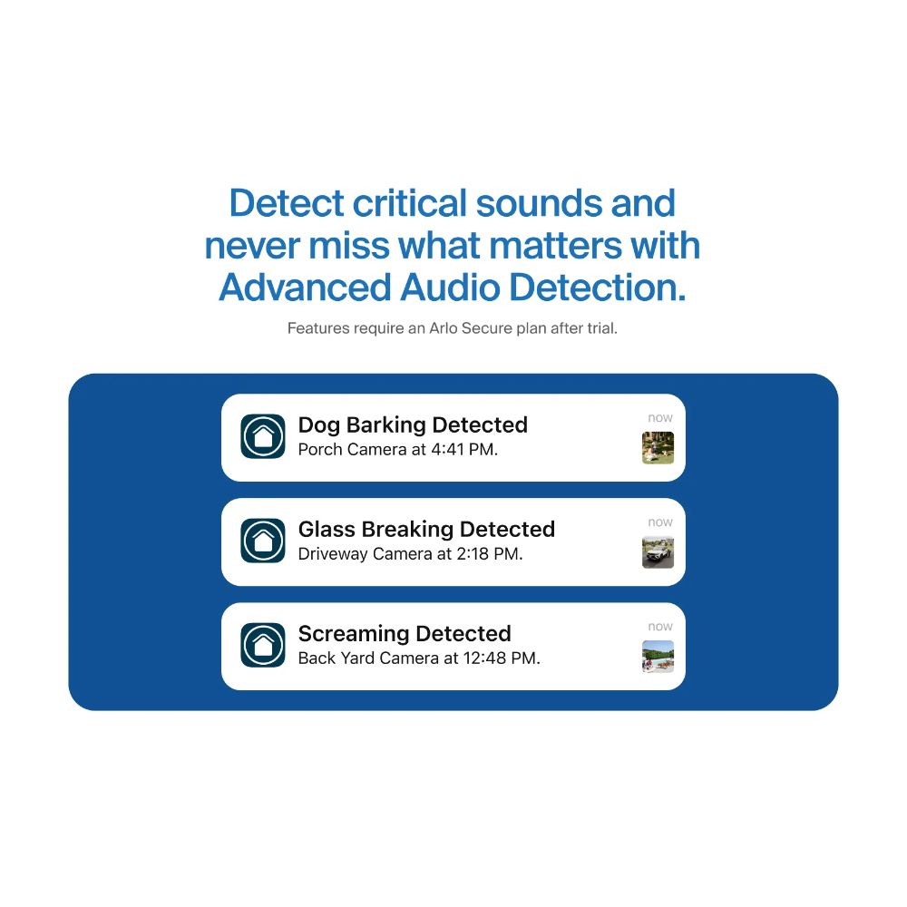 [1]Maintaining Arlo Secure features requires a paid subscription after the trial period ends, and these features, including the length of cloud storage, may vary by region. For current information on Arlo Secure features by region, visit www.arlo.com/arlosecure.