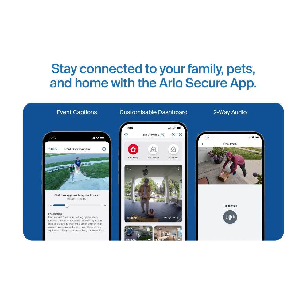Protect the outside of your home with AI-powered Arlo Intelligence that identifies potential security threats and sends alerts to your smartphone. See what’s happening with crystal-clear 2K video and read AI-generated descriptions of what’s in each video clip. Plus, with pan and tilt viewing capabilities, you’ll have every angle covered.
