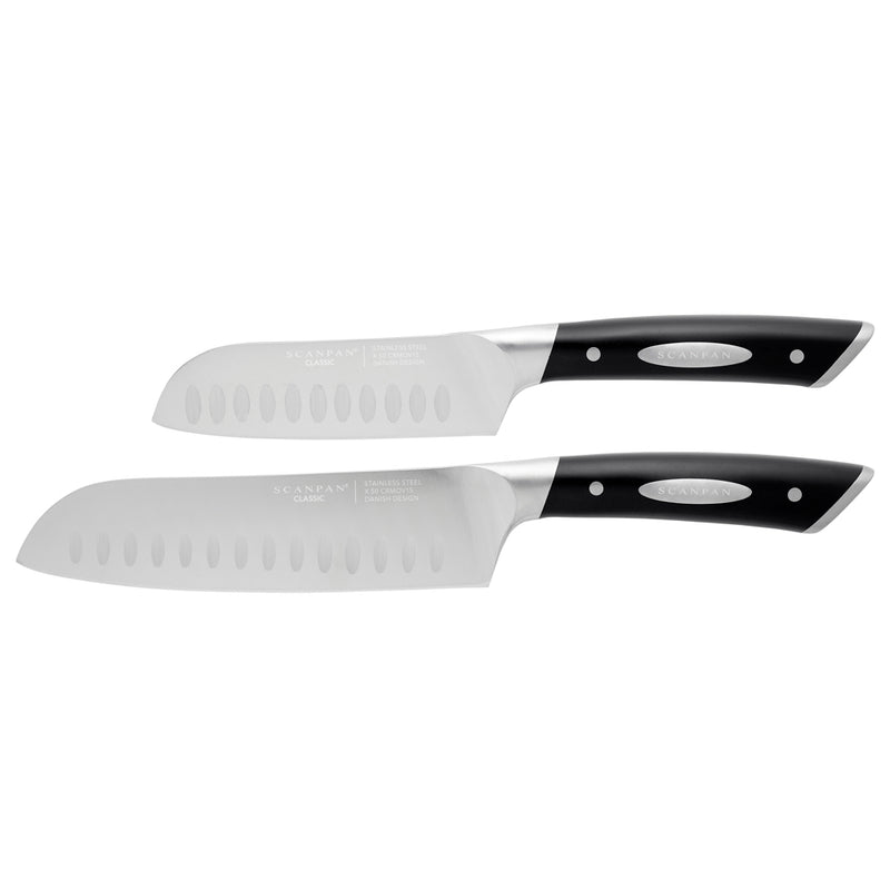This Classic 2 Piece Knife set contains a 12.5cm Santoku w/Granton Edge and an 18cm Santoku w/Granton Edge. All Scanpan knives are guaranteed against manufacturing faults and defects for 10 years. Scanpan has rejuvenated their current popular Classic knives by upgrading the range with an elegant and sleek design - the Classic knife range has been modernised and the performance enhanced.