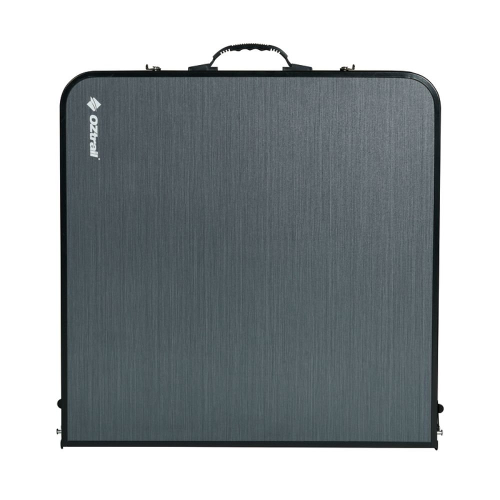 Sturdy aluminium folding table with storage underneath.
