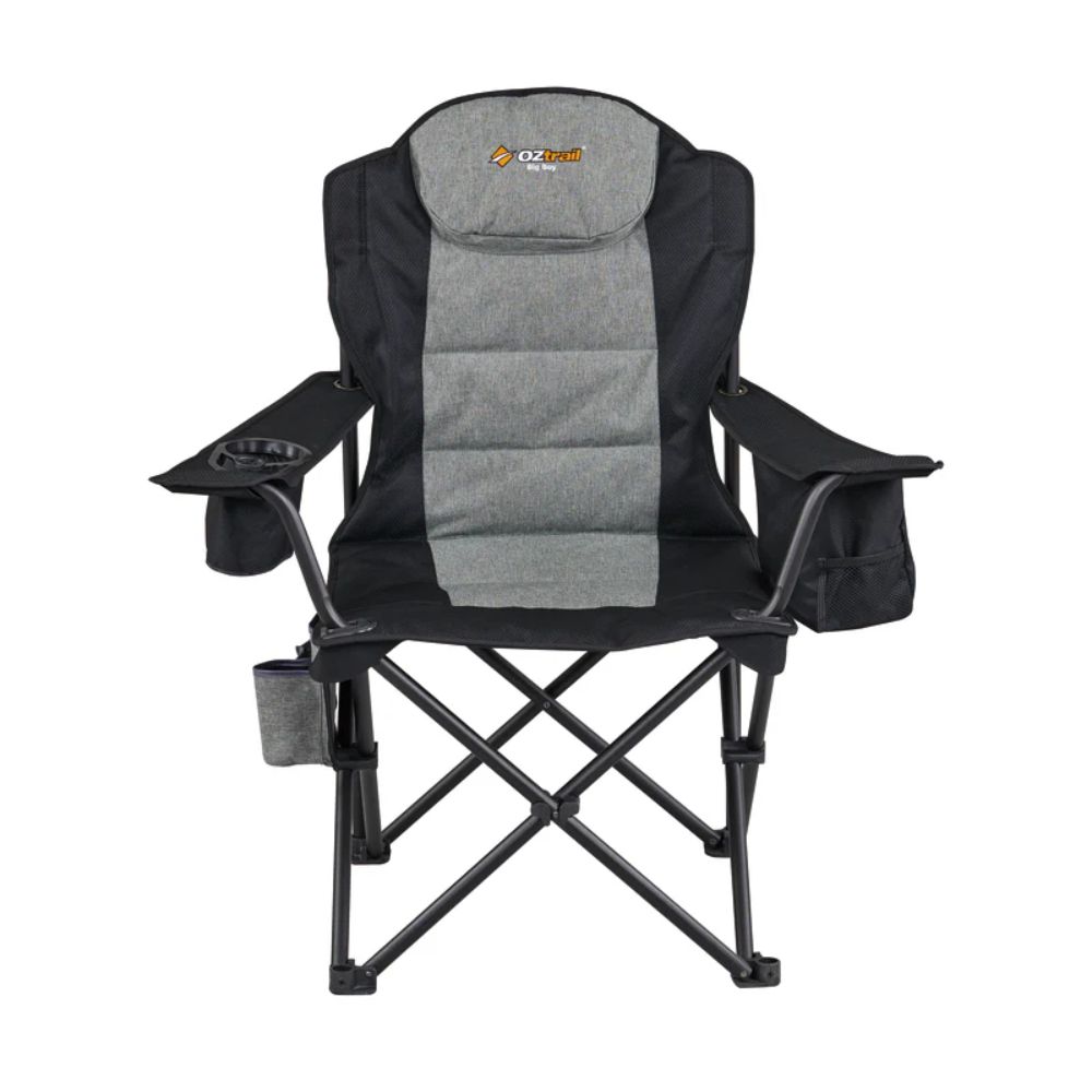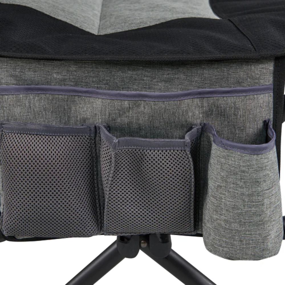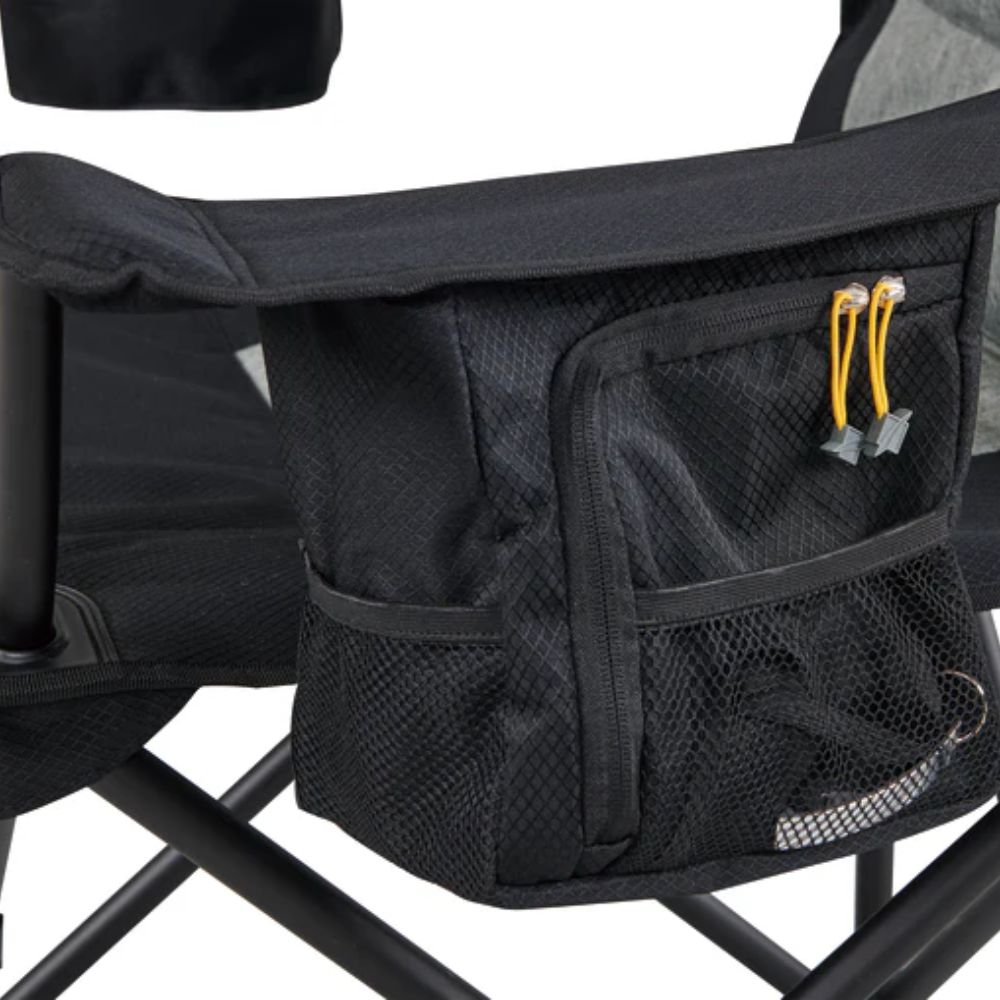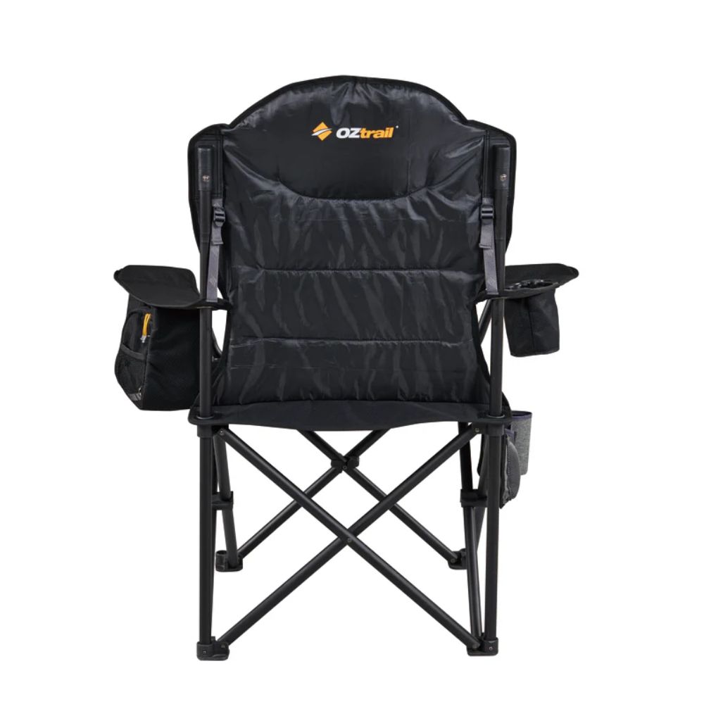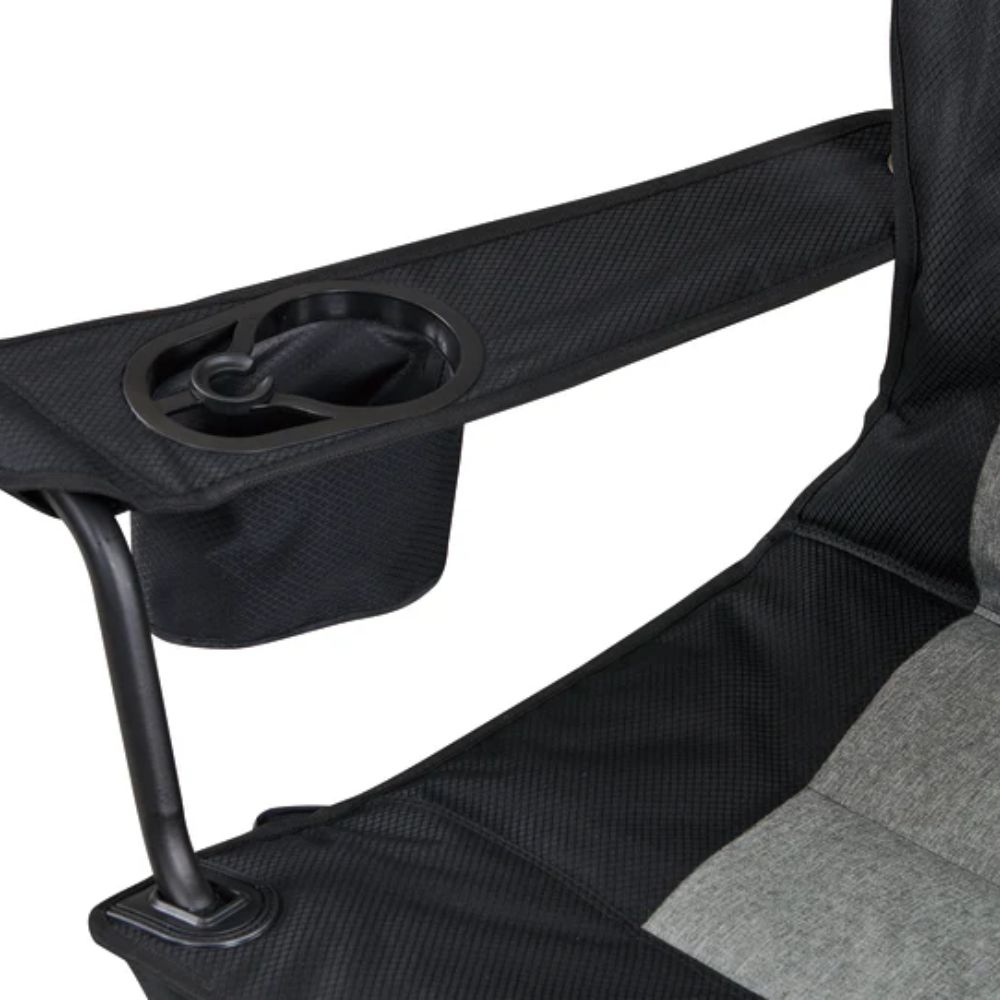 This oversized armchair offers superior comfort and stability with a cross-braced steel frame and double-layer padded fabric. Features an insulated drink holder, bottle opener, side organiser, and mesh pocket.